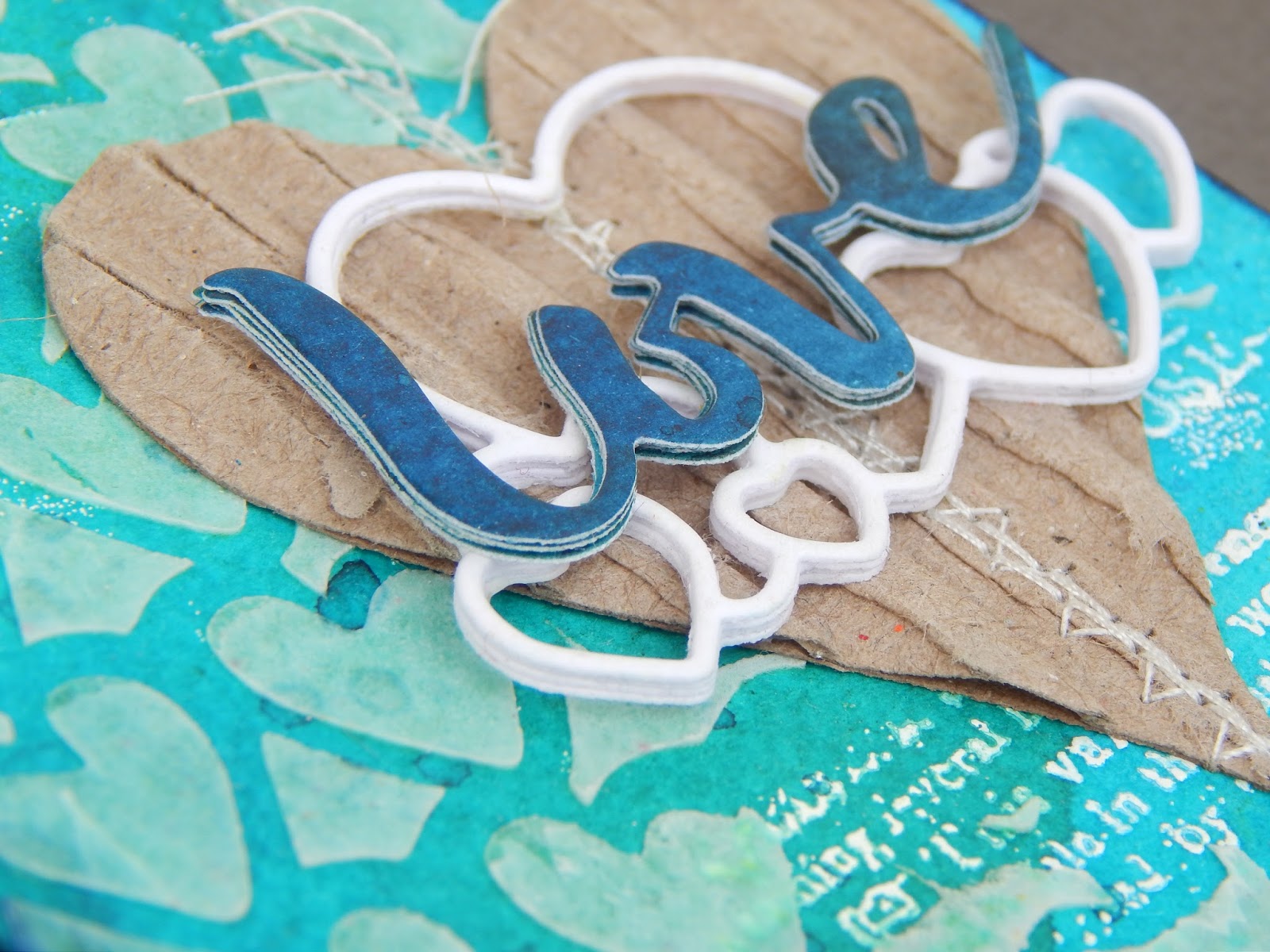 First I stamped and white heat embossed a piece of card before spritzing with water and sprinkling with brushos ... this was the difficult bit for me as I didn't have any control over where the colour went!! I used my heat tool to dry the panel as I wanted to create some hard lines in the colour. Once the panel was dry I spread texture paste through a stencil but only in limited areas - I wanted the hearts to wrap around the die cut heart. The corrugated heart was left over from another project and was just what I needed to help create a cluster of elements to create a focal point. I machine stitched the corrugated heart onto the tag before die cutting the clustered heart die and 'love' sentiment lots of times!! I also adhered three small hearts from the clustered heart die that I had cut from another piece of brusho-ed card. Added some twine and ribbon and considered it complete.