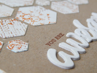 I stamped some cream card with background stamps using distress inks before die cutting some different sized hexagons which I then adhered to the card base. The sentiment was die cut a number of times to provide added dimension. I'd planned the card to be portrait but when it came to adding the sentiment it seemed to work better as a landscape card.