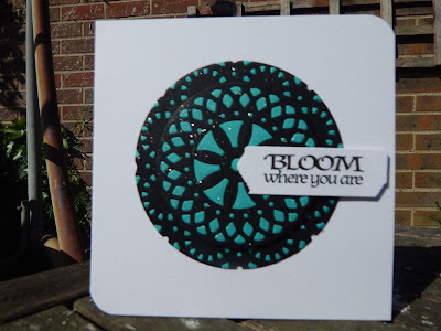 I die cut the doily twice once in black once in teal, I then pieced the teal pieces into the black doily.  I used to circle dies to remove the centre and to create a frame.  The centre of the doily is foam backed to add some dimension.  I covered the whole image with clear wink of stella to add a little sparkle - you can just about see it in the photographs.