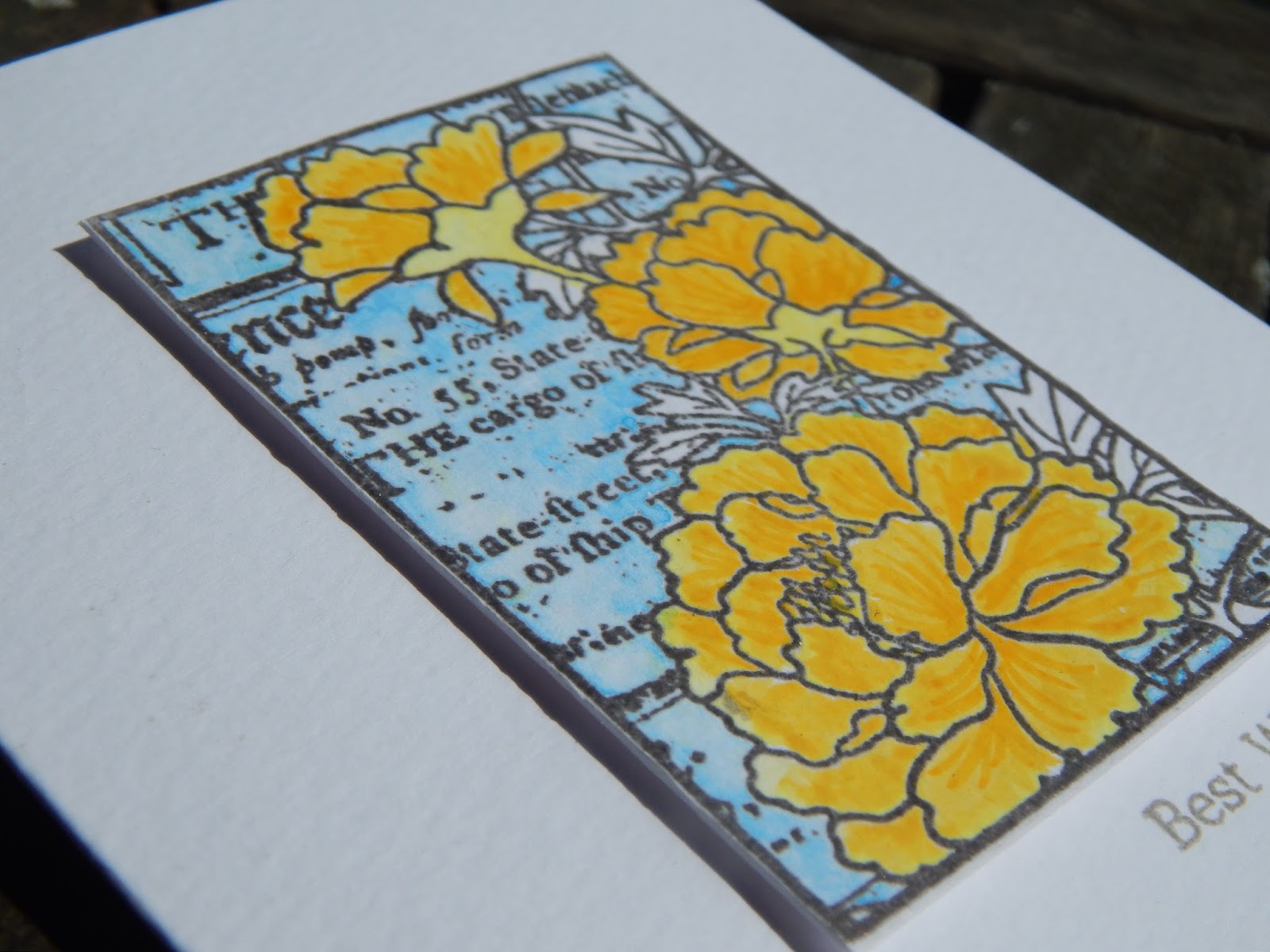 I stamped the image with pumice stone distress ink and then heat embossed it with clear embossing powder.  I like the effect you get when embossing an image it creates a cleaner line for water colouring.  I water coloured the image added some foam tape and popped it onto the base before adding a small sentiment.