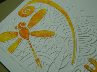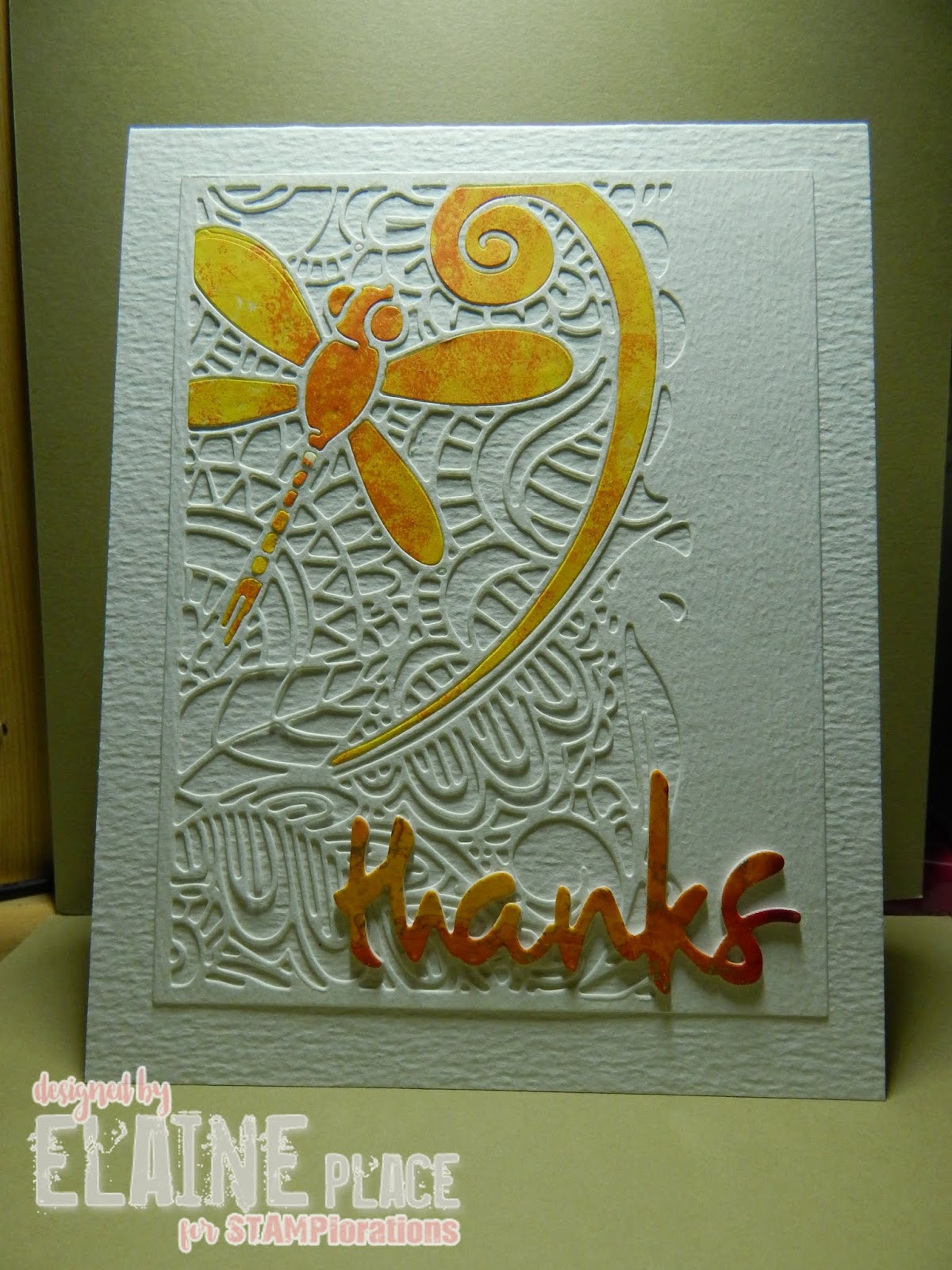 I first created a panel using alcohol inks and gold foil to die cut 'thanks' from - I also cut a number of 'thanks' from white before stacking and adhering them together. I die cut the dragonfly from cream card and also from a panel created using my gelli press plate, acrylic paints and stencils. Having adhered the complete panel to a card front I then pieced the dragonfly and flourish in to position, added the sentiment and considered the card finished. A very clean and simple design but effective (I hope!).